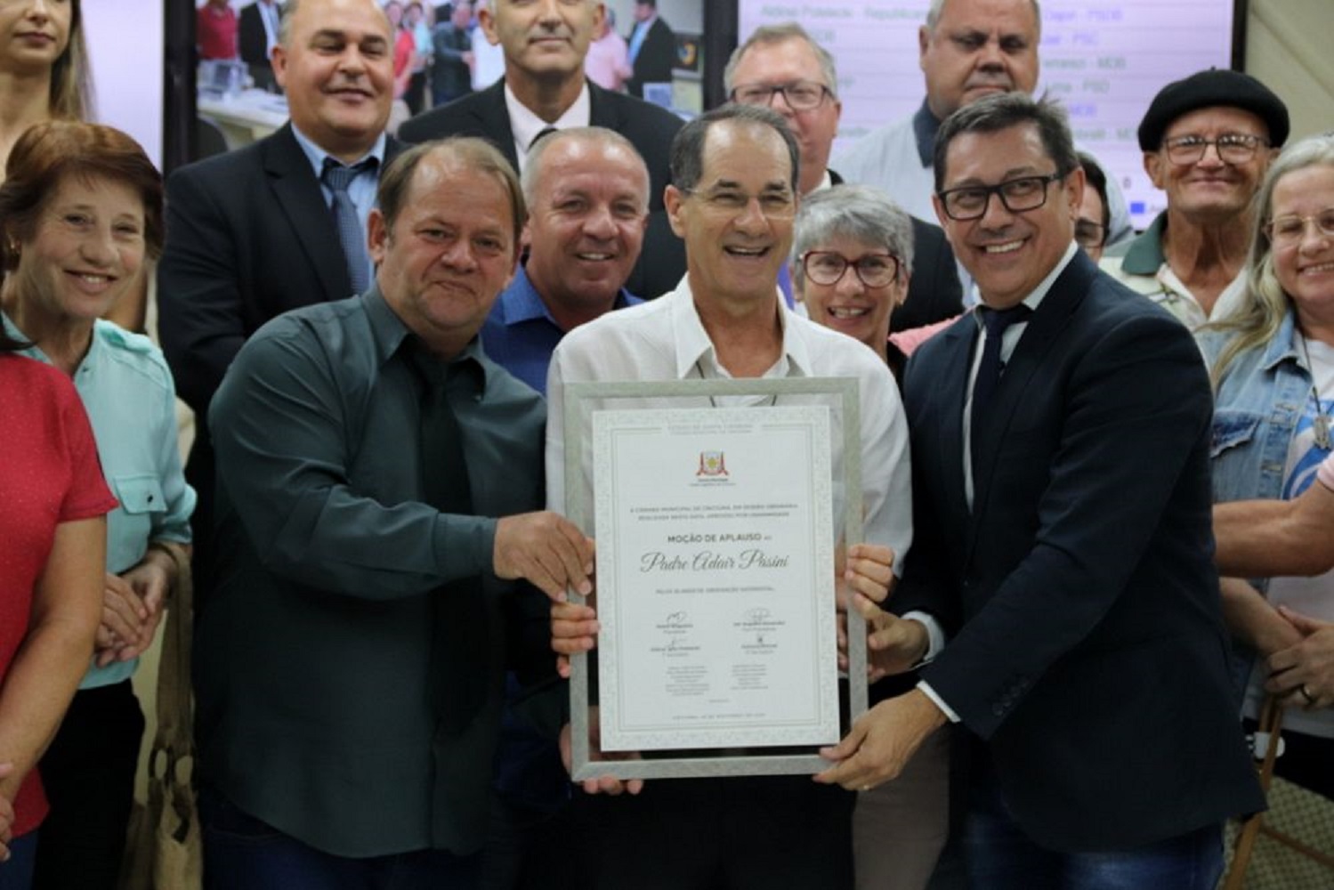 Os 35 anos de ordenação sacerdotal do Padre Adair Pasini foram lembrados em homenagem prestada pelo Legislativo, nessa segunda-feira (18). A Moção de Aplausos é de autoria dos vereadores Daito Feuser (PSDB) e Júlio Kaminski (PSDB).