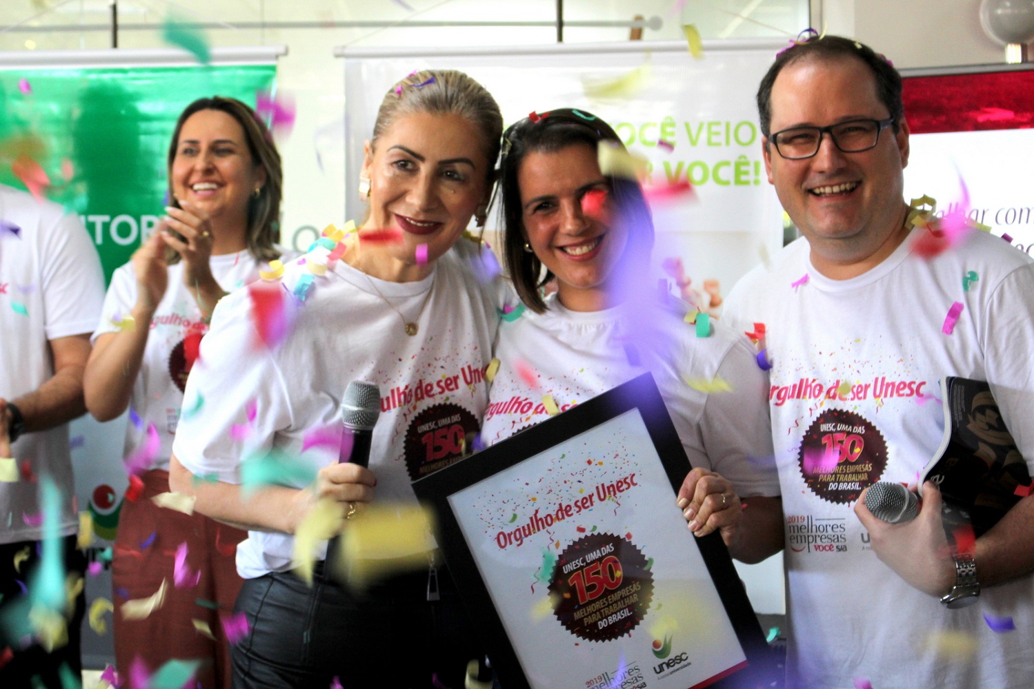 A tarde desta quinta-feira (21) foi de comemoração na Unesc. Os professores e funcionários foram acolhidos no hall da Reitoria para celebrar o destaque na premiação As Melhores Empresas para Trabalhar no Brasil 2019. A honraria foi entregue na última terça-feira (19), em São Paulo, pela FIA (Fundação Instituto de Administração).