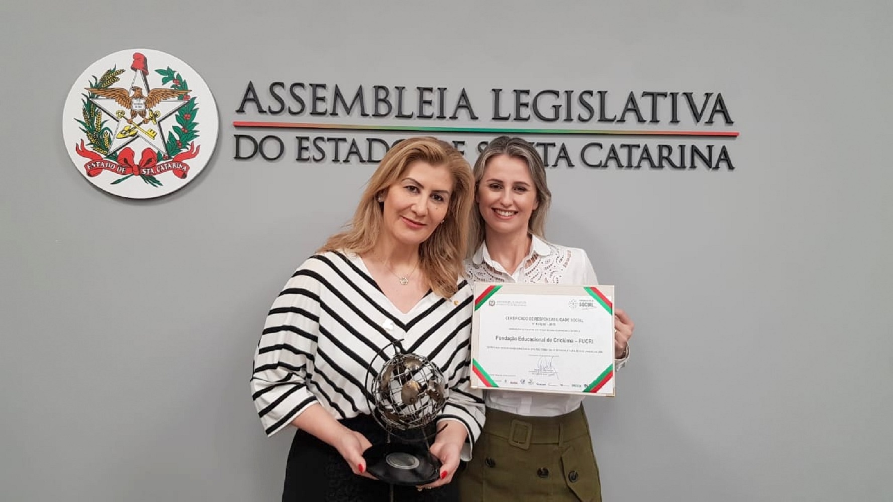 A responsabilidade socioambiental incluída no dia a dia do trabalho na Unesc foi reconhecida de forma oficial, na noite dessa segunda-feira (2), em Florianópolis. Isto porque a capital do Estado foi palco nesta noite da premiação da “Certificação de Responsabilidade Social – Uma Atitude de Valor Catarinense”, ação promovida pela Alesc (Assembleia Legislativa de Santa Catarina) na qual a Universidade recebeu o Troféu Responsabilidade Social – Destaque SC 2019, entre as organizações sem fins lucrativos.