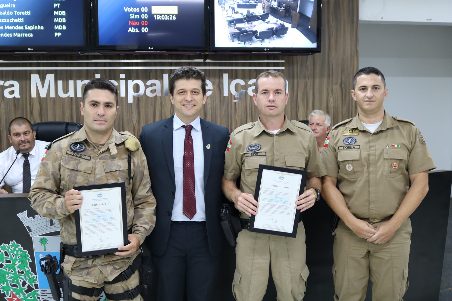 Foram aprovadas pela Câmara Municipal de Içara moções parabenizando os soldados da Polícia Militar de Içara, Diego Francisco Lima e Ézio Francisco Fernandes, que socorreram vítimas de um acidente automobilístico e identificaram um sequestro em andamento, conseguindo salvar a vítima.