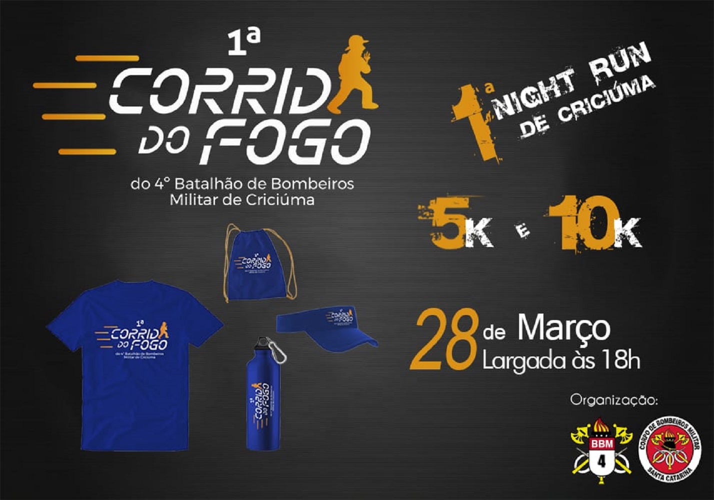 O 4º Batalhão de Bombeiros Militar (4º BBM), realizará em 28 de março a 1ª Corrida do Fogo. Com objetivo de estimular a atividade física em qualquer fase da vida e promover a integração dos Bombeiros Militar, Comunitários e população em Criciúma, a largada está prevista para as 18 horas, na sede do Corpo de Bombeiros de Criciúma.