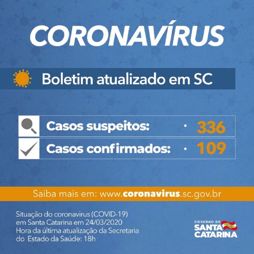 Santa Catarina tem 109 casos confirmados do novo coronavírus, conforme boletim de atualização divulgado pelo governador Carlos Moisés em coletiva de imprensa nesta terça-feira (24). Há pacientes com diagnóstico positivo para a doença Covid-19 em todas as regiões do Estado.