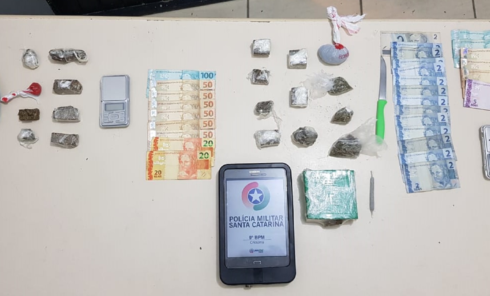 Durante as buscas no local, os militares encontraram 565 gramas de substância análoga à maconha, além de R$ 383,00 em espécie e uma balança de precisão. O suspeito ainda informou que comercializaria a droga para outro homem. Assim, os policiais foram ao local indicado e encontraram, com o outro suspeito, mais 438 gramas do entorpecente, além de R$ 440,00 e uma balança de precisão, totalizando, nas duas abordagens, um quilo de maconha.