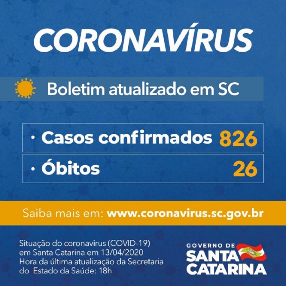 Santa Catarina tem 826 casos confirmados de Covid-19, doença que já causou a morte de 26 pessoas no estado. Os dados foram divulgados pelo governador Carlos Moisés no início da noite desta segunda-feira, 13. O número de casos confirmados representa um aumento de 6,4% em relação ao dia anterior. Os dois óbitos que entraram nos registros são o de um homem de Criciúma e uma mulher de Joinville, ambos de 70 anos.