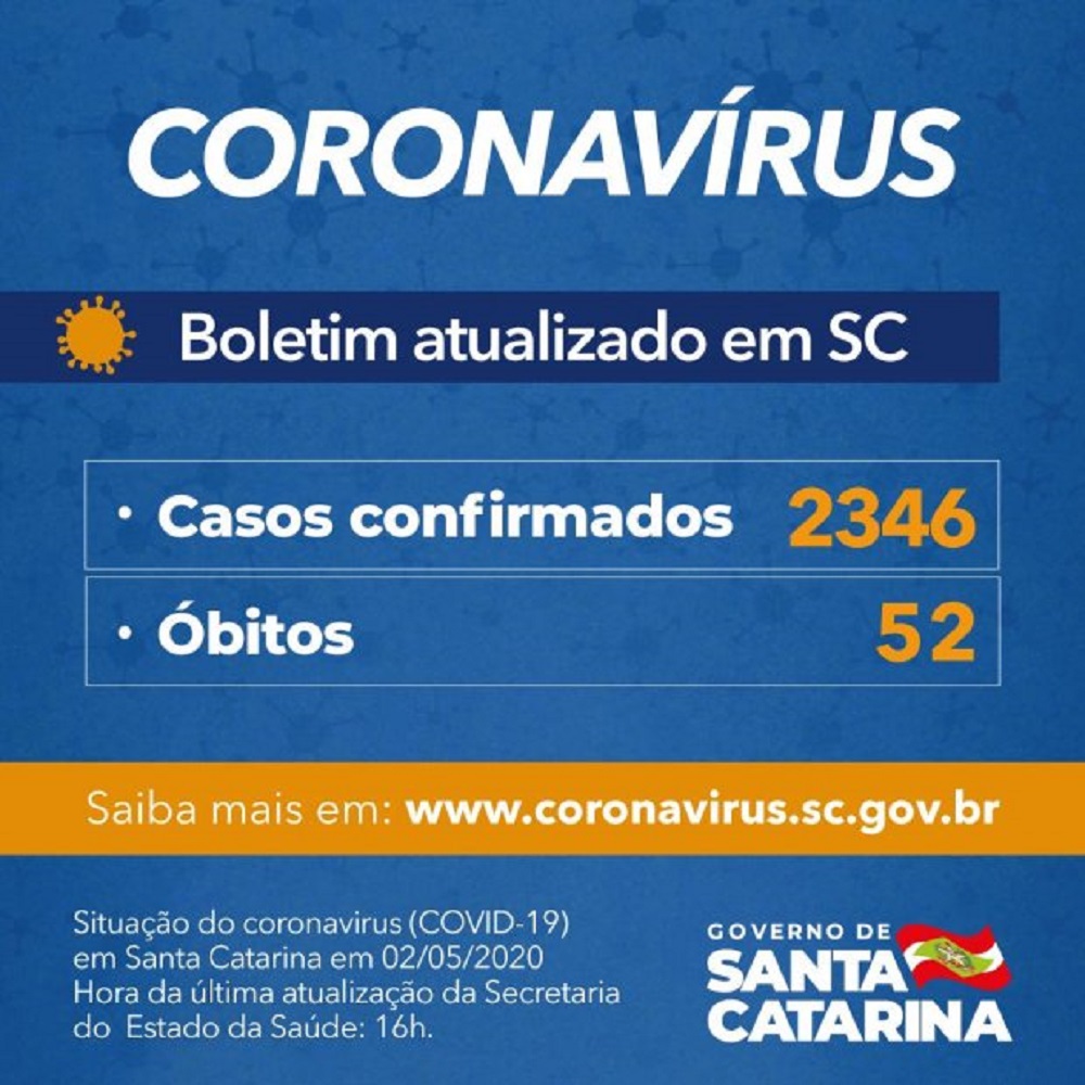O Governo do Estado informa que há 2.346 casos confirmados de infecção pelo novo coronavírus em Santa Catarina. A Covid-19 já causou 52 óbitos no estado desde o início da pandemia. Os óbitos mais recentes são o de uma mulher de 83 anos, moradora de Antônio Carlos, e de um homem de 57, residente em Jaraguá do Sul. Ambos apresentavam comorbidades.