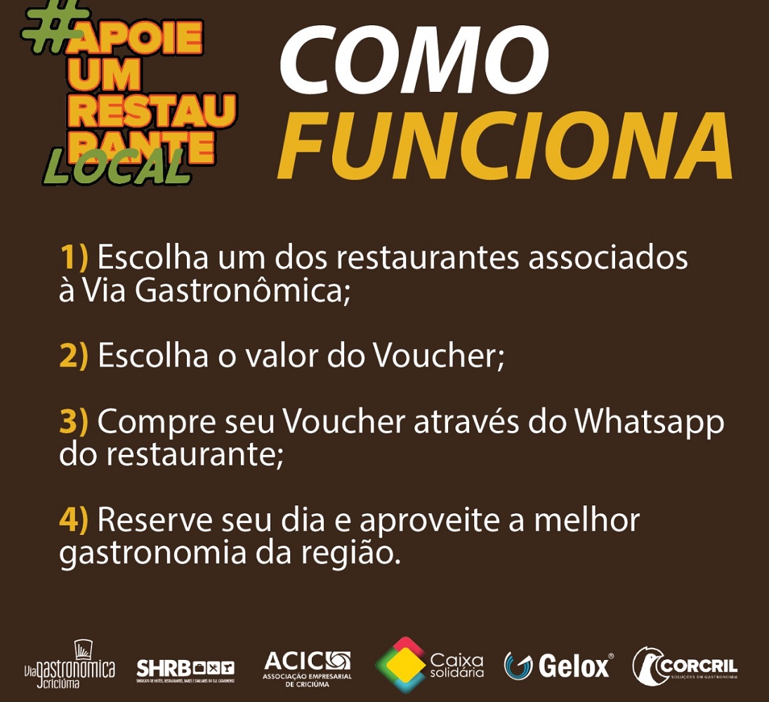 Restaurantes, pizzarias, churrascarias, hamburguerias e empórios de vinho participam da promoção. A relação completa está disponível nos canais oficiais da Via Gastronômica no Facebook (https://www.facebook.com/viagastronomicacriciuma/) e no Instagram (https://www.instagram.com/viagastronomicacri/), bem como as orientações sobre como aderir à campanha e os números de contato de cada local. “O cliente escolhe a casa, aciona o WhatsApp ali indicado, faz o pagamento e recebe o voucher pelo mesmo WhatsApp. Depois, é só consumir”, detalha Vetorazzi.