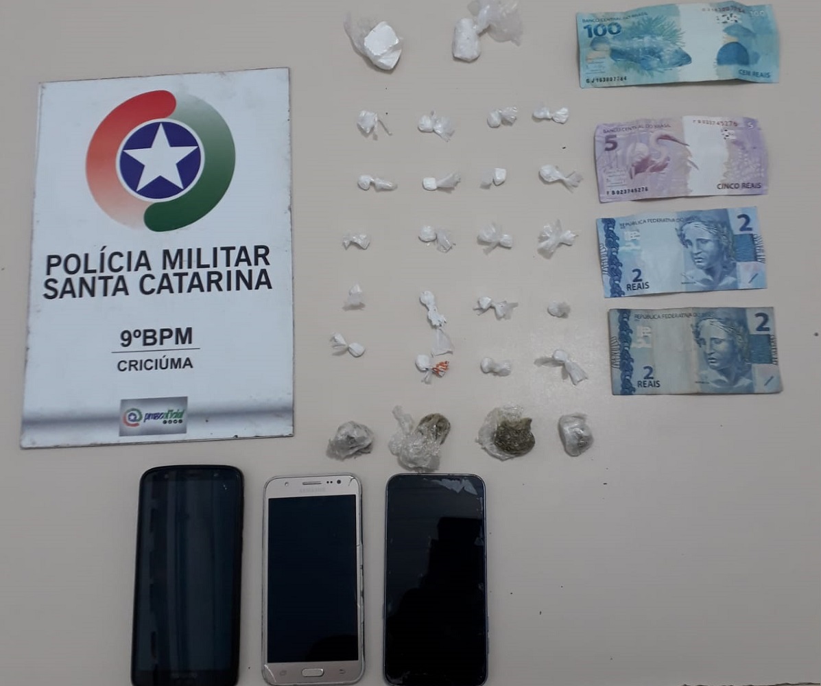 Conforme divulgado pela corporação, quando os policiais chegaram ao local, avistaram uma pessoa num ponto conhecido pelo comércio ilícito. O suspeito tentou fugir, mas foi acompanhado em abordado. Na sequência, com apoio de um cão farejador, os militares encontraram um invólucro com 5,5 gramas de cocaína, além de um torrão de maconha com 1,5 grama da droga. Também foram apreendidos um celular e R$ 109,00.