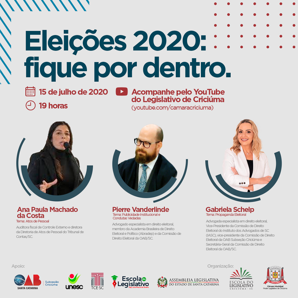 O que muda com o adiamento do calendário eleitoral deste ano e a publicidade durante a campanha eleitoral. Esses são alguns dos temas que serão amplamente discutidos no Webinário organizado pela Câmara Municipal de Criciúma, por meio da Escola do Legislativo. O evento ocorrerá na próxima quarta-feira (15/7), a partir das 19 horas, com transmissão ao vivo pelo canal do Youtube da Câmara (youtube.com/camaracriciuma). O webinário também conta com o apoio da UNESC, OAB Criciúma, Alesc – Escola do Legislativo da Assembleia Legislativa-, e Tribunal de Contas de Santa Catarina.