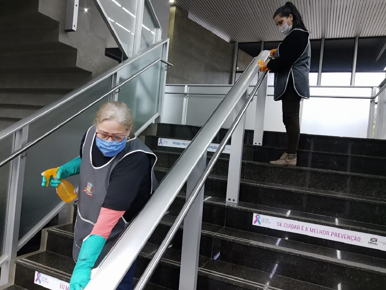 A sede do Governo de Criciúma, localizada no Paço Municipal Marcos Rovaris, passou por um processo de higienização neste final de semana. Os espaços de maior circulação e movimentação, como corredores, corrimãos, portas e cadeiras, receberam os procedimentos. Foram utilizados materiais a base de cloro, desinfetantes e álcool 70%.