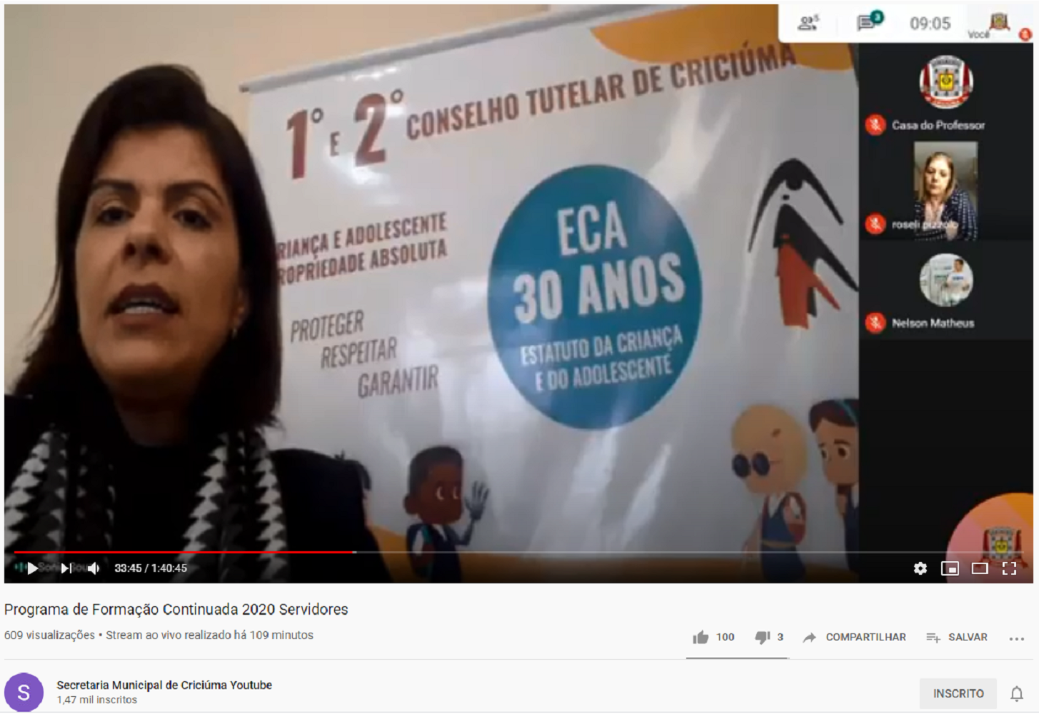 Nesta quinta-feira (16), os serventes escolares e estagiários da rede municipal de Criciúma passaram por uma capacitação sobre a ‘Garantia dos Direitos da Criança’. Ministrada pela conselheira tutelar, Sônia Souza, a capacitação foi em comemoração aos 30 anos do Estatuto da Criança e do Adolescente (ECA). A iniciativa ocorreu no canal do Youtube da Secretaria Municipal de Educação.