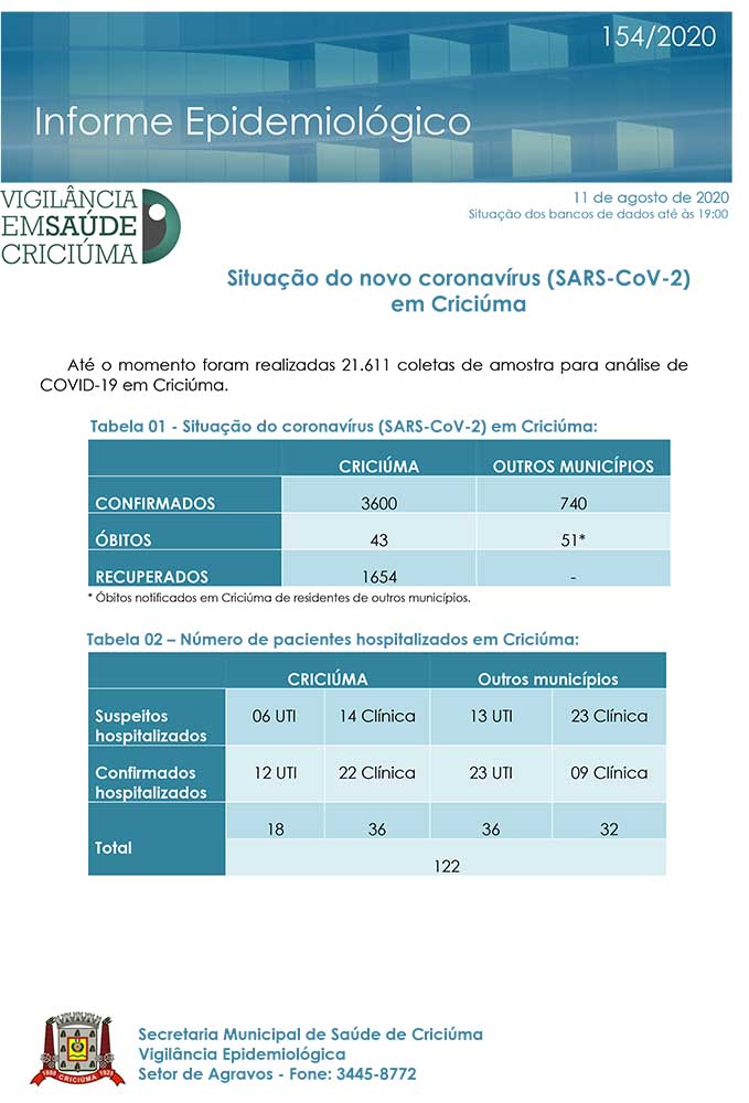 O Portal Mais Sul divulga diariamente os números de casos de Covid-19 em cada uma das 12 cidades da Região Carbonífera. Os dados são divulgados por cada uma das prefeituras em seus canais oficiais de comunicação.