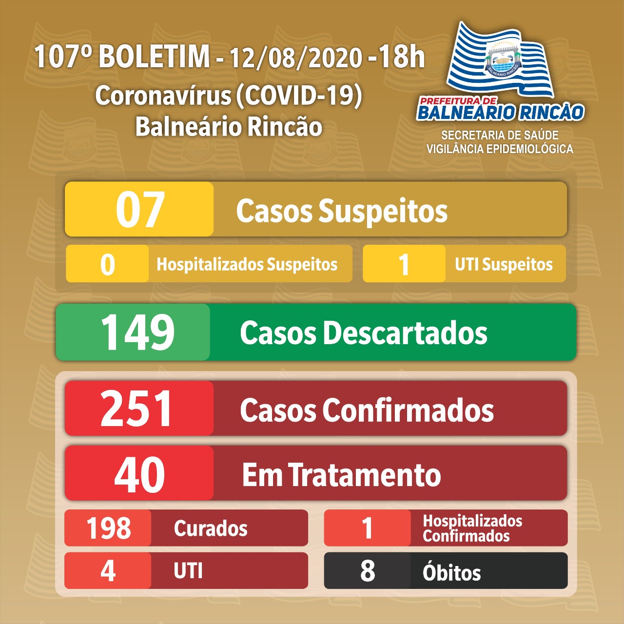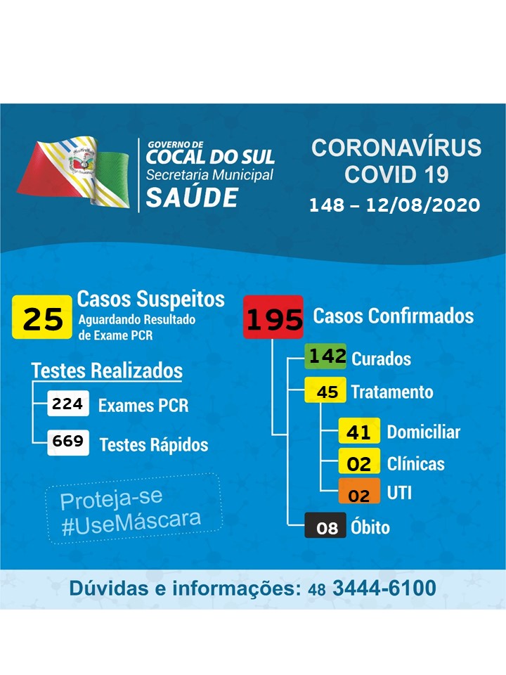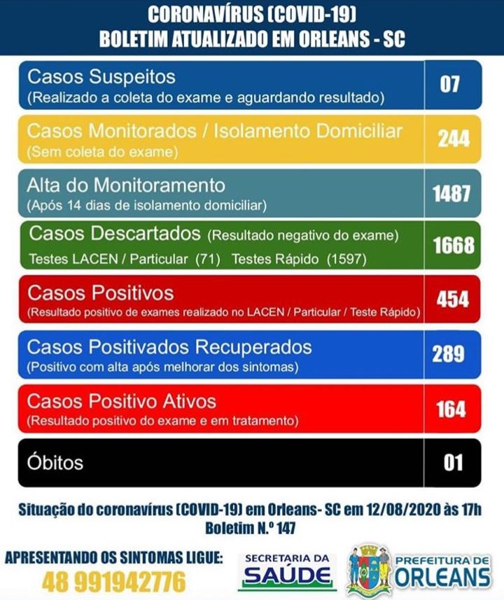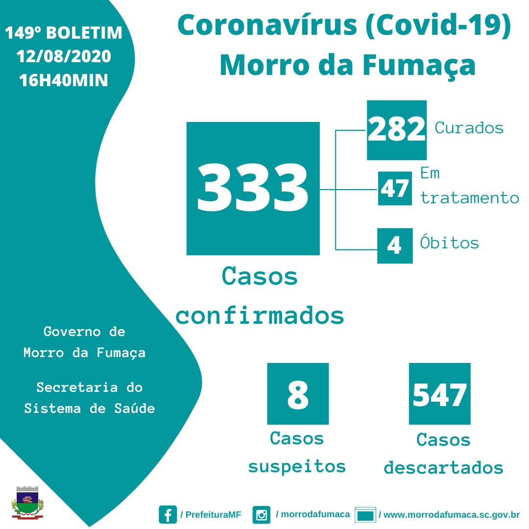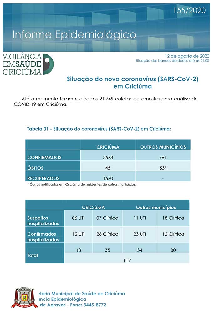 Confira os números de casos confirmados até esta quarta-feira, dia 12 de agosto de 2020.