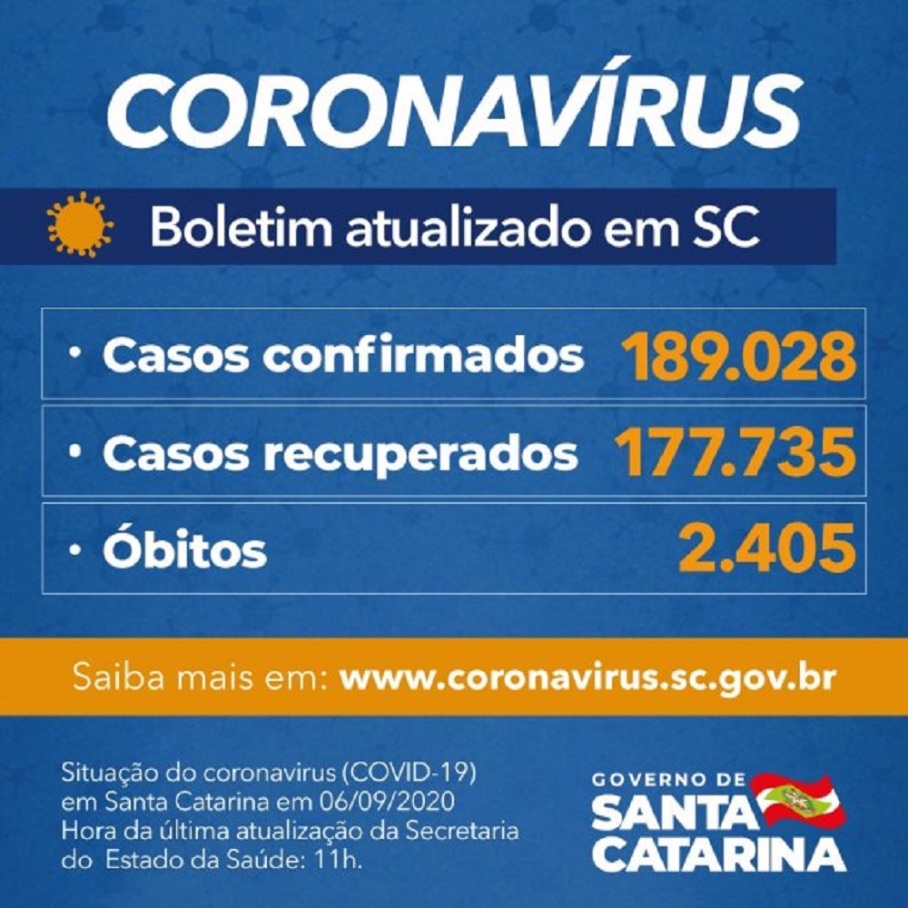 Santa Catarina registra 189.028 casos de Covid-19. Dessas, 177.735 são considerados recuperados e 8.888 continuam em acompanhamento. O dado foi divulgado neste domingo, 6. O novo coronavírus causou 2.405 óbitos no estado desde o início da pandemia. Esses números colocam a taxa de letalidade em 1,27%.