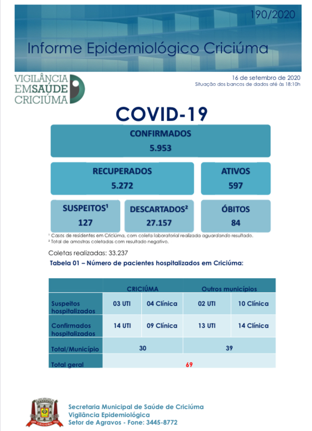 Confira os números de casos confirmados em cada cidade até essa quarta-feira, dia 16 de setembro de 2020.