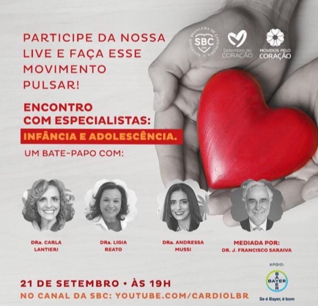 Durante todo o mês de setembro, a Sociedade Brasileira de Cardiologia (SBC) promove a Campanha Setembro do Coração, com atividades alusivas à conscientização e prevenção. Nesta segunda-feira (21), uma live destacará a importância dos cuidados cardiológicos em crianças e adolescentes. O evento virtual será realizado a partir das 19 horas, através do canal da SBC no YouTube, e é aberto ao público em geral.