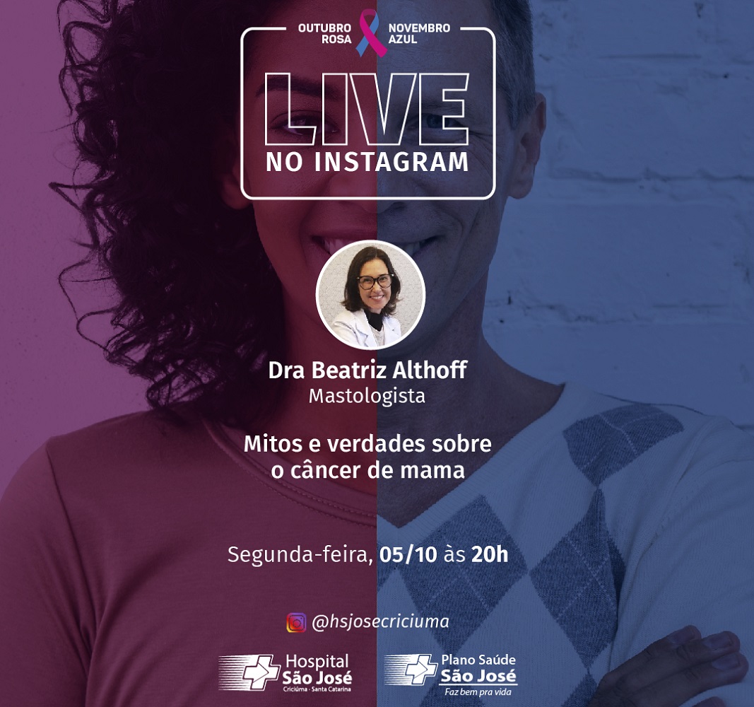 Para iniciar as atividades sobre o mês de conscientização e prevenção ao Câncer de mama, o HSJosé irá realizar uma live em sua conta no Instagram (@hsjosecriciuma) na próxima segunda-feira 05/10/2020. O objetivo é trazer informações quanto aos mitos e verdades sobre a doença. A convidada é a médica mastologista Dra. Beatriz Althoff (CRM/SC – 11419 | RQE – 7758).
