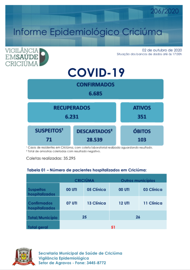 O Portal Mais Sul divulga diariamente os números de casos confirmados de Covid-19 em cada uma das 12 cidades da Região Carbonífera. Os dados são divulgados pelas secretarias municipais de saúde.