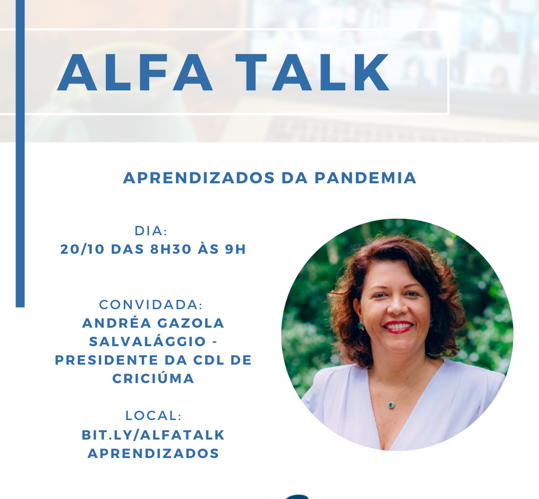A próxima edição do Alfa Talk marcada para terça-feira (27) terá a participação da orientadora de negócios Cristiane Barata Búrigo, com início às 8h30. O conteúdo das edições anteriores pode ser acessado no Youtube (https://youtu.be/MuC5QdnMu7Q) e no Portal Engeplus, parceiro do Alfa Talk, e em áudio nos principais aplicativos de podcasts (Spotify, Apple Podcasts, Google Podcasts e Castbox). E o link direto para a sala do Zoom está aqui. (bit.ly/AlfaTalkAprendizados).