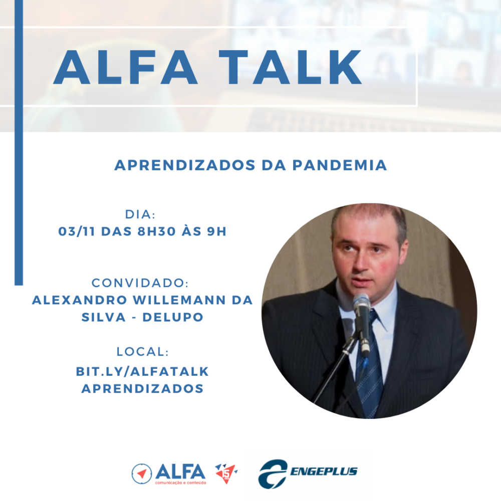 O evento, promovido pela Alfa Comunicação e Conteúdo, terá a mediação da jornalista e diretora da agência, Andressa Fabris. O encontro remoto sempre às 8h30, seguindo até as 9h pelo Zoom, com link direto para a sala aqui. (bit.ly/AlfaTalkAprendizados). O conteúdo de todas as edições anteriores pode ser acessado no Youtube e no Portal Engeplus, parceiro do Alfa Talk, e em áudio nos principais aplicativos de podcasts (Spotify, Apple Podcasts, Google Podcasts e Castbox).