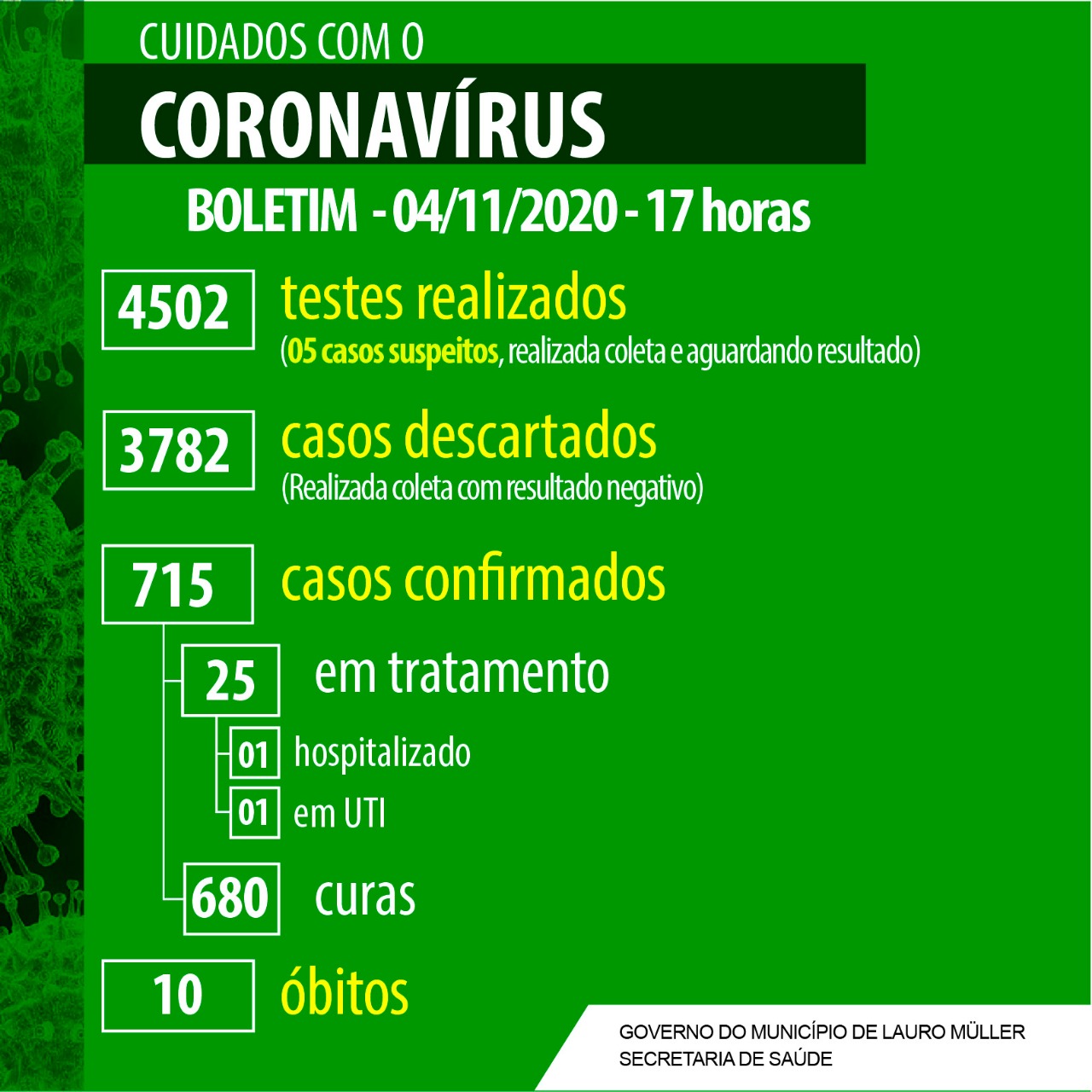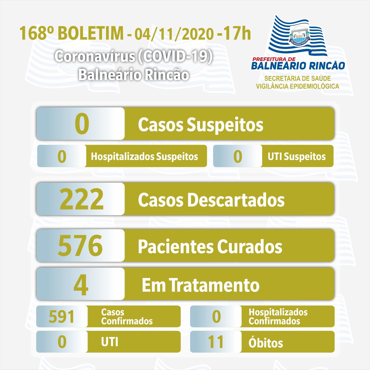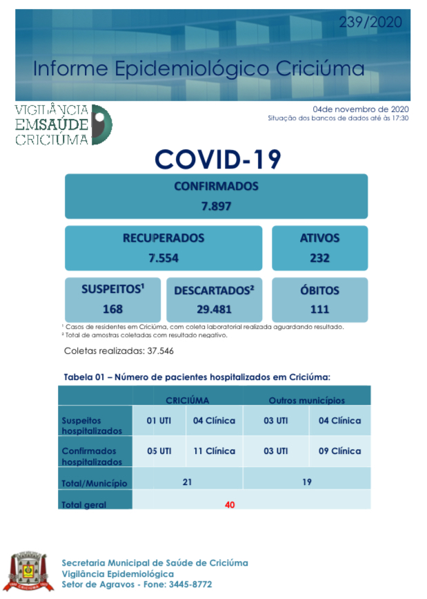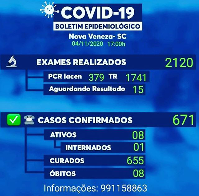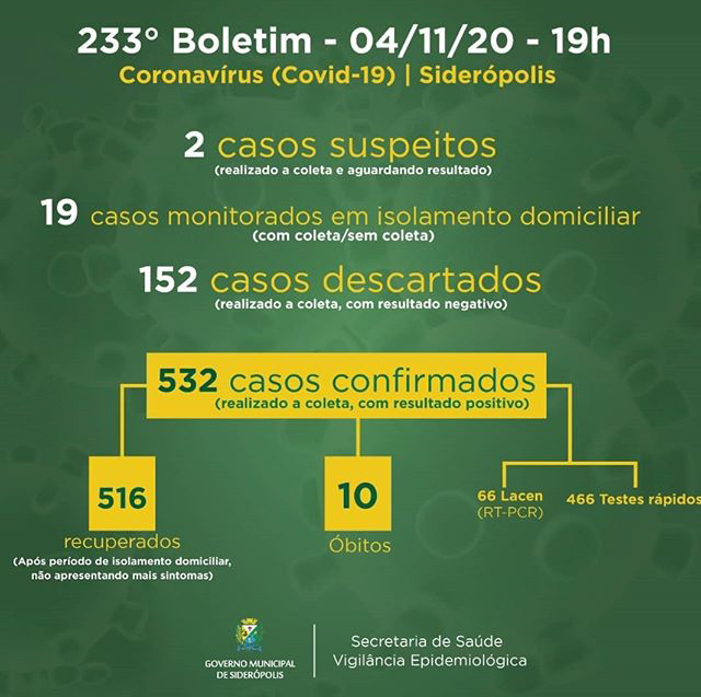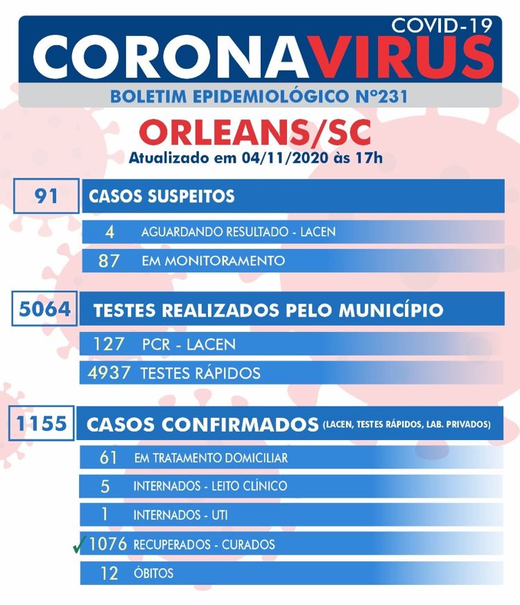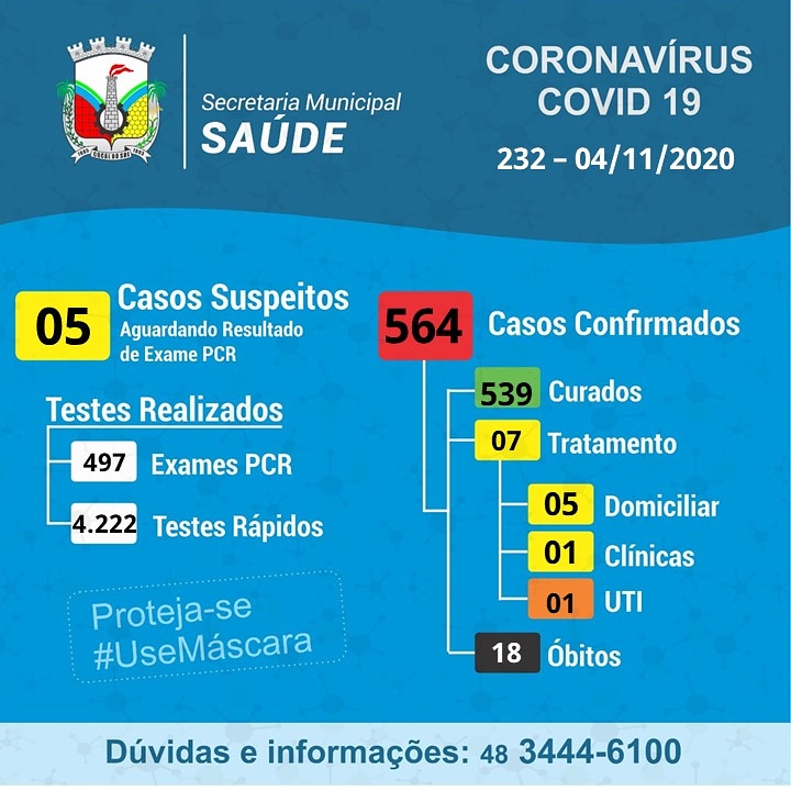 Confira os números de casos confirmados em cada cidade até essa quarta-feira, dia 4 de novembro de 2020.