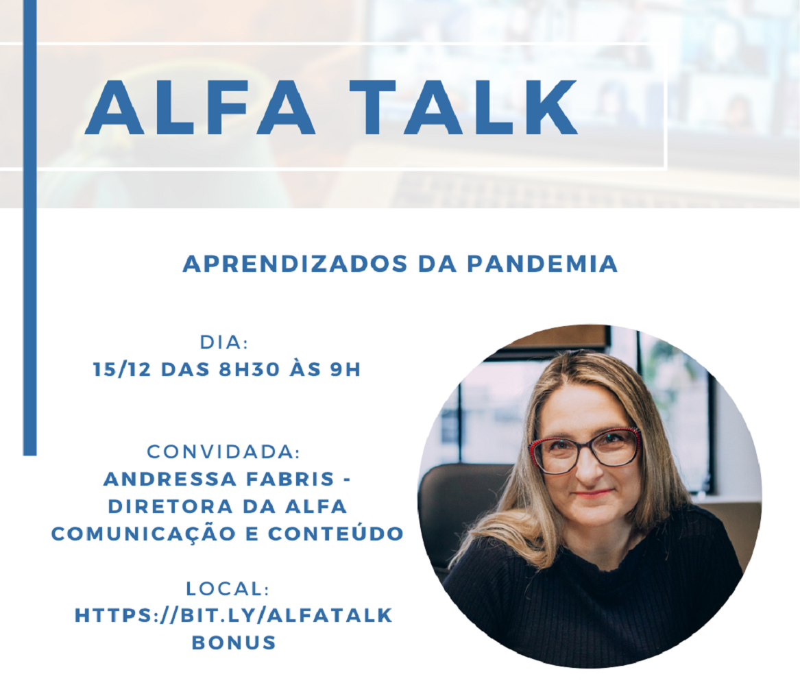 Durante o segundo semestre de 2020, a Alfa Comunicação e Conteúdo promoveu a segunda temporada do Alfa Talk. As conversas semanais com 30 minutos de duração trouxeram em 15 edições algumas reflexões sobre gestão de crise, oportunidades e aprendizados colhidos desde o início da pandemia com a participação de líderes e gestores de empresas da região sul de Santa Catarina. Para finalizar a série de talks, a diretora da Alfa Comunicação e Conteúdo vai compartilhar as experiências da agência durante a crise sanitária na próxima terça-feira (15), às 8h30.