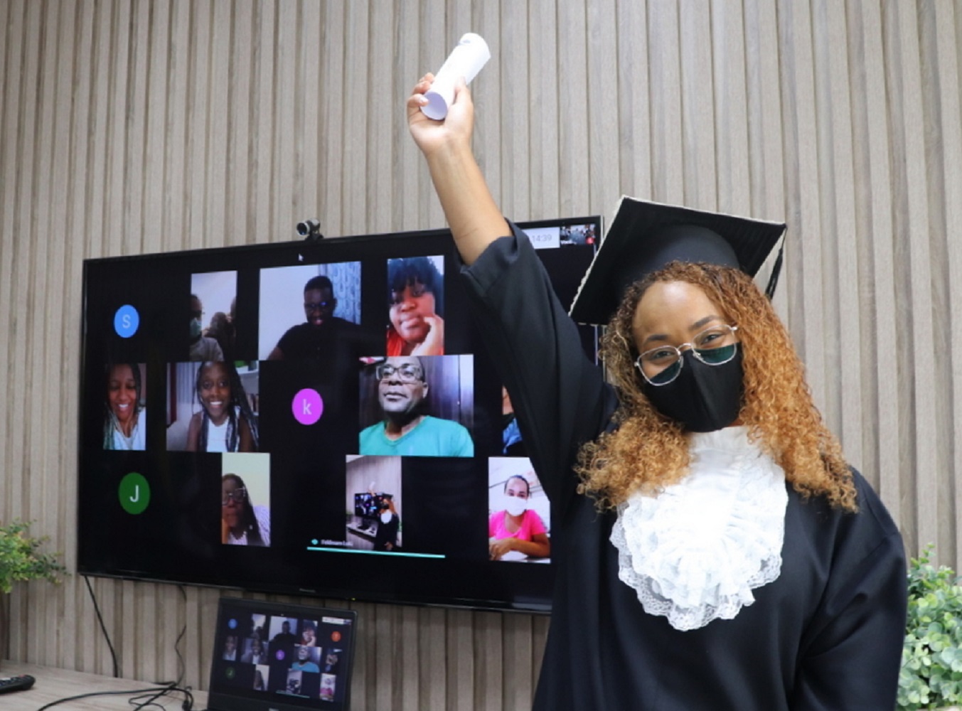A emoção tomou conta da sala de reuniões da Reitoria da Unesc nesta sexta-feira (15/1). Acompanhada do irmão e de alguns amigos, Feldman Cristina de Almeida Lulú realizou um grande sonho: concluir o curso superior. A agora bacharela em Administração – Comércio Exterior, participou da Colação de Gabinete com a presença virtual da família e dos amigos, diretamente de Angola, que puderam participar deste dia tão importante por meio de uma reunião virtual com direito a comemoração, lágrimas e falas dos pais, irmãos e amigos da graduanda.