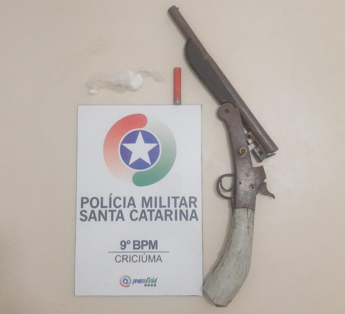 A Polícia Militar apreendeu uma arma de fogo e drogas, por volta das 14h35 desse domingo (11), no bairro Ana Maria, em Criciúma.