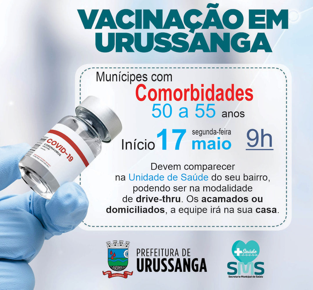 Dando continuidade à Campanha de Vacinação contra o Covid-19, a Secretaria Municipal de Saúde de Urussanga recebeu mais doses do imunizante do Covid-19 e irá iniciar na próxima segunda-feira (17) a vacinação das pessoas com comorbidades, na faixa etária de 50 a 55 anos.
