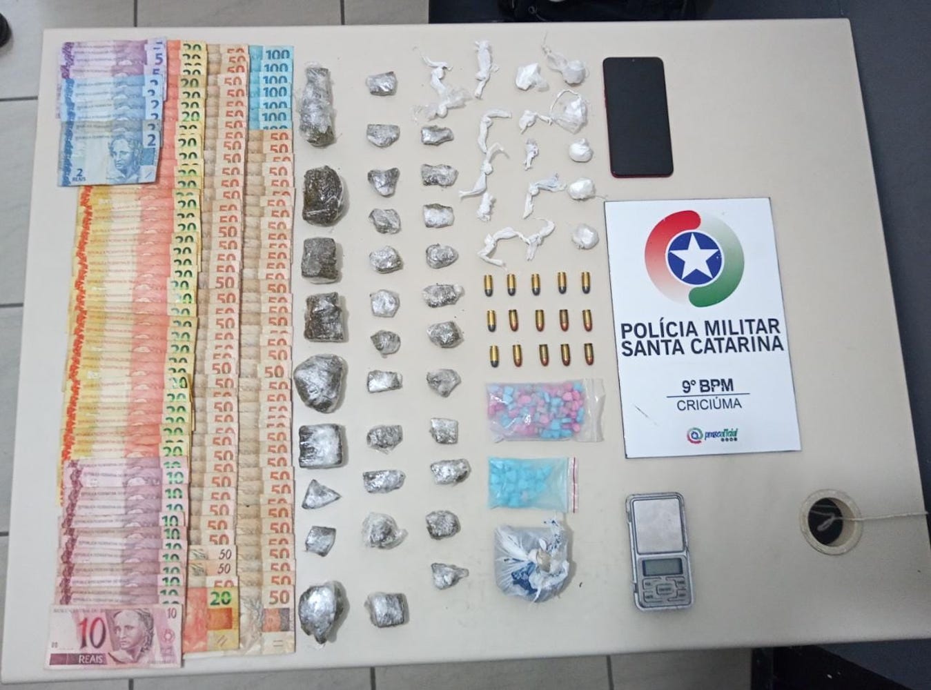 Já com apoio do Canil do 9º Batalhão, foram encontrados mais entorpecentes e 15 munições de calibre .380. Além disso, na residência foram apreendidos R$ 5.882,00. Enquanto isso, o total de entorpecentes foi de 362 gramas de maconha, 36 gramas de cocaína e 126 comprimidos de ecstasy.