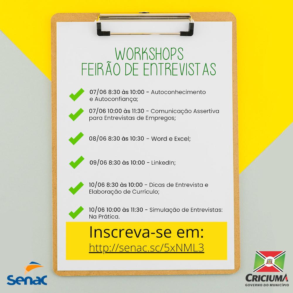 Na próxima semana, entre os dias 7 e 10 de junho, os inscritos no site Balcão de Empregos poderão participar gratuitamente deworkshops instrutivos sobre entrevistas de emprego. O feirão está marcado para o dia 12 de junho, no Ginásio Municipal Irmão Walmir Antônio Orsi e está sendo organizado pelo Governo Municipal, por meio da Secretaria de Assistência e Habitação. Já os treinamentos estão sendo realizados em parceria com o Serviço Nacional de Aprendizagem Comercial (Senac) de Criciúma, e a preparação será feita na sede da entidade, rua Henrique Lage.