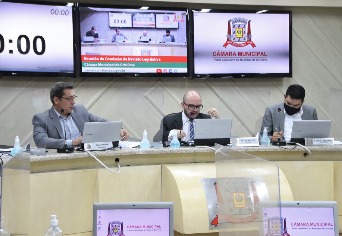 Os vereadores membros da Comissão Especial Temporária de Revisão Legislativa da Câmara de Criciúma se reuniram na tarde desta terça-feira (15), para continuar com as análises de mérito das sugestões de alteração de leis recebidas de entidades do município. As nove proposições enviadas por meio do ofício 29/2021 pela Procuradoria Geral e por fiscais do município foram pauta do encontro. Entre esses temas, três foram divididos para que mais dados sejam recolhidos, auxiliando na análise em reunião futura.