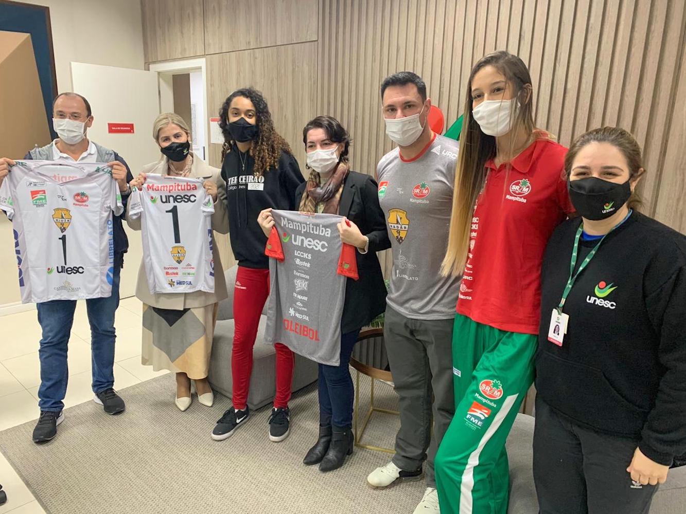 O técnico da equipe, Luciano Iribarrem Carvalho, ao lado das atletas Eduarda dos Santos Leite, de 16 anos, e Kamili Oliveira Silva, de 19 anos, fez a entrega de uma cesta e de camisetas do time para a reitora, assim como para a diretora do Colégio Unesc, Giselle dos Passos Vieira, e para o coordenador do curso de Educação Física e responsável por mediar a parceria, Joni Marcio Farias, acompanhado também da profissional do Setor de Esportes da Unesc, Gisele Torri.
