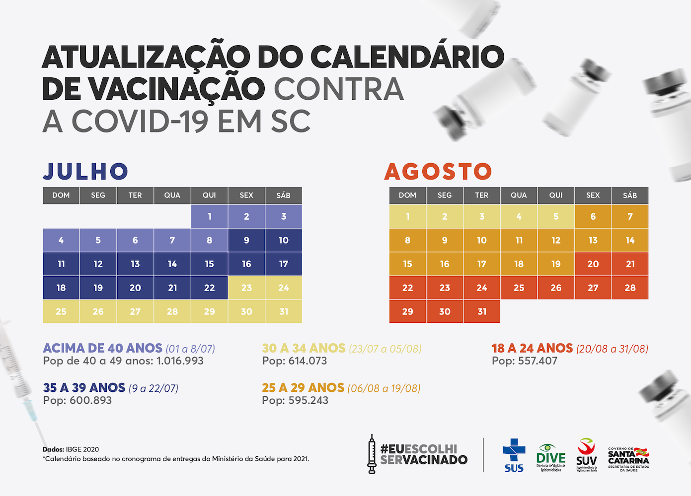 A Comissão Intergestores Bipartite (CIB) divulgou, na tarde dessa quinta-feira (1º), um novo calendário de vacinação contra a Covid-19 em Santa Catarina. O objetivo é vacinar todas as pessoas acima de 18 anos até o dia 31 de agosto.