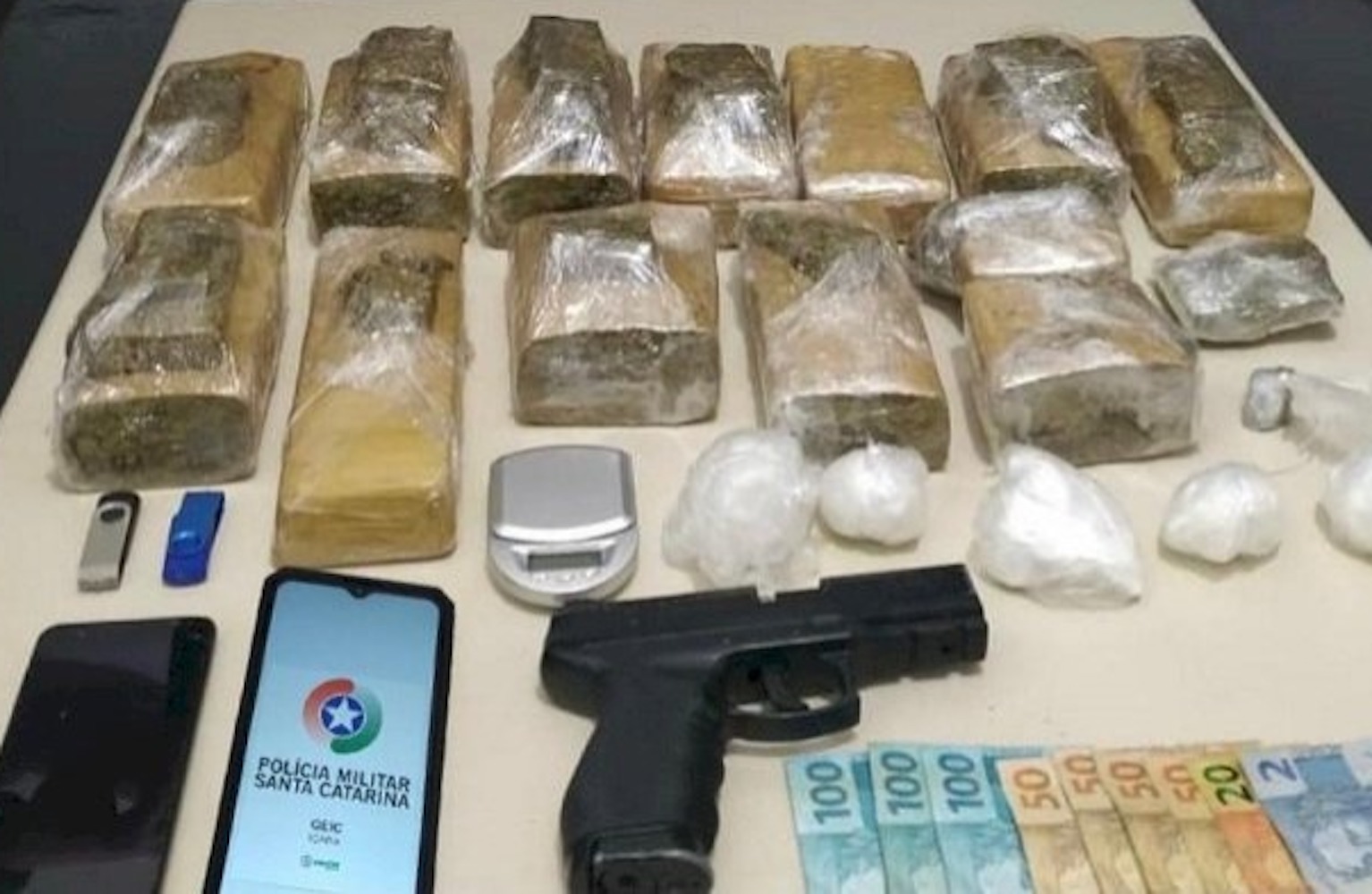 Conforme divulgado pela corporação, na residência do suspeito foram encontrados 5,978 quilos de maconha, 180 gramas de cocaína, uma arma de pressão, 37 cápsulas de munição e R$ 522, além de objetos relacionados ao tráfico.