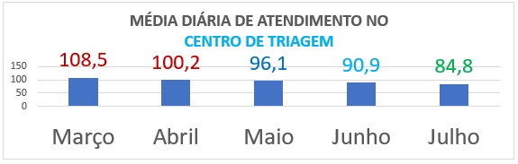 O volume de atendimentos no Centro de Triagem caiu de 108,5/dia em março, quando abriu suas portas, para 84,8/dia em julho. A queda em números percentuais foi de 21,8% em todo período. No gráfico abaixo, é possível observar a vertical descendente no volume de atendimentos: