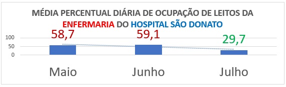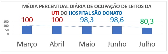 Em relação ao hospital São Donato, a média diária de atendimento de pacientes com Covid-19, começou a virar a curva para baixo em junho. Na UTI da instituição hospital, a média diária do percentual de ocupação de leitos caiu 19,7% entre abril e julho, quando os índices começaram a apontar para a vertical descendente, conforme mostra o gráfico abaixo: