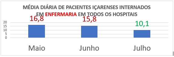 Outro número a ser avaliado, é quanto ao total de pacientes exclusivamente içarenses atendidos em diversos hospitais e não apenas no São Donato. Nas enfermarias, os pacientes de Içara passaram a ocupar menos 39,8% de vagas em média/dia, caindo de 16,8% em maio para 10,1% em julho:
