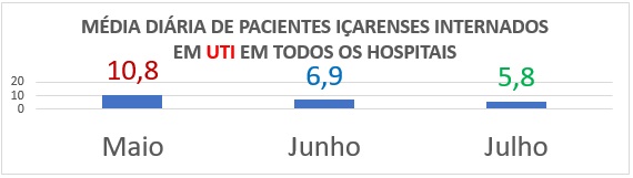 Já nas UTI´s, considerando internação de pacientes exclusivamente içarenses em diversos hospitais, o número percentual médio de ocupação por dia, caiu 46,2% entre maio e julho, quando iniciou a curva descendente, conforme mostram os números do gráfico abaixo: