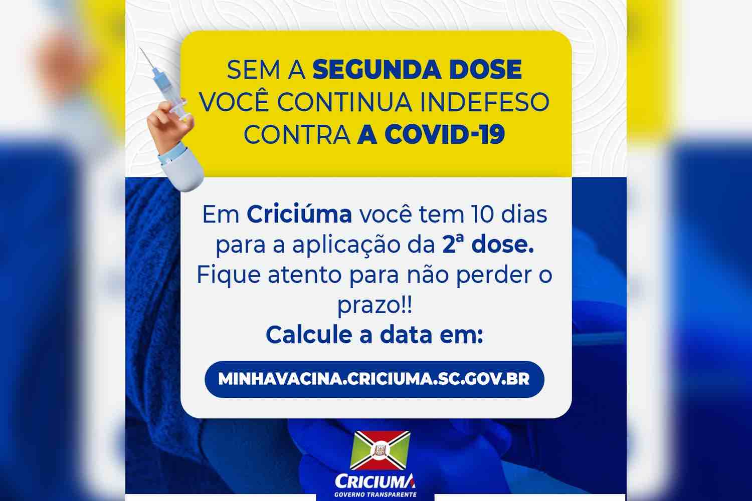 De acordo com dados da Vigilância em Saúde, são mais de 2,3 mil pessoas que deixaram de fazer AstraZeneca, 883 coronavac e pelo menos 619 da Pfizer. “O calendário de aplicação está bem claro e a data exata para a segunda dose pode ser buscada no portal minhavacina.criciuma.sc.gov.br, mas também na carteirinha de saúde ou tirando dúvidas nas Unidades Básicas de Saúde”, afirmou o gerente de Vigilância em Saúde, Samuel Bucco. “Precisamos muito que as pessoas compareçam para fecharmos o ciclo e dar continuidade a outras faixas etárias”, enfatizou o gerente.