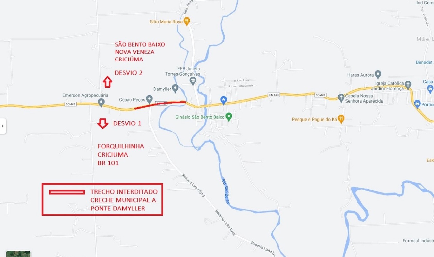 Para os motoristas que saem da localidade de Rio Cedro Médio e querem ir até o município de Forquilhinha, devem acessar a Rodovia Augusto Vitali (Linha Reta). Outra alternativa é desviar pela Rodovia Municipal 15 de Julho, que será a forma de ir para o centro de Nova Veneza e Criciúma.