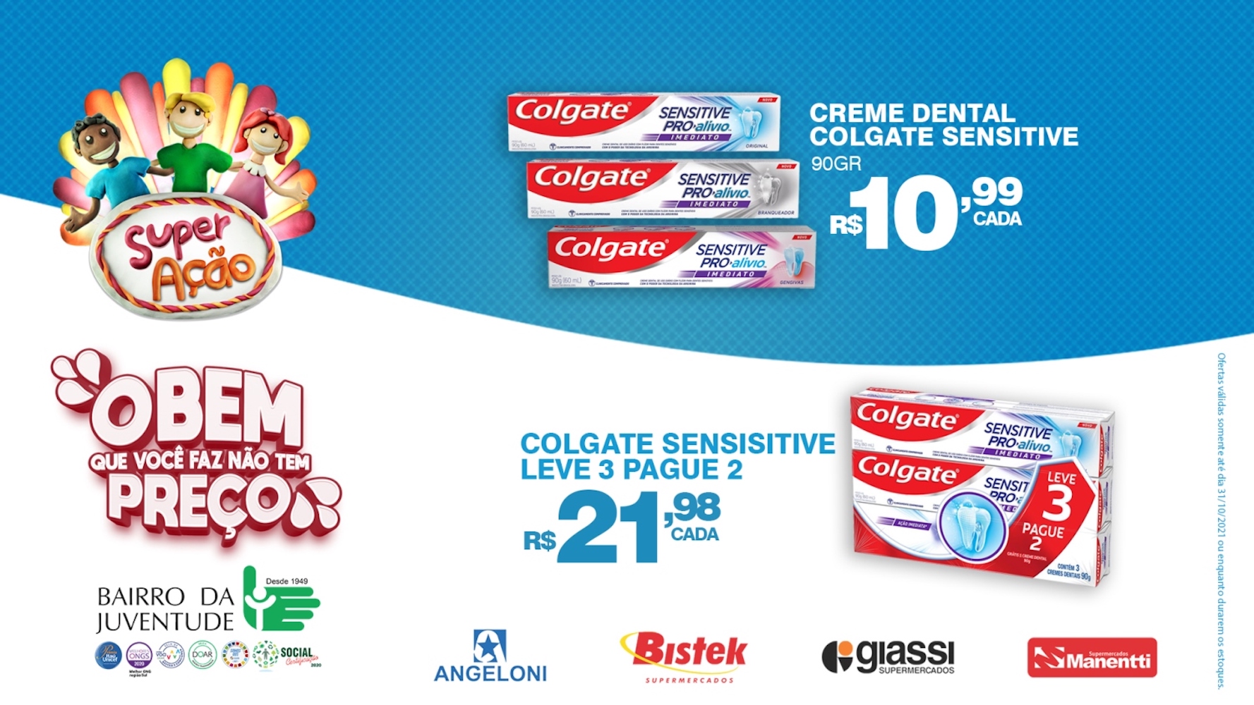 Durante todo o mês de outubro, a Colgate será parceira da Campanha SuperAção, ação promovida pelo Bairro da Juventude em parceria com os supermercados Angeloni, Bistek, Giassi e Manentti. A empresa traz produtos da marca a preços especiais e o consumidor poderá adquirir o Creme Dental Colgate Sensitive, 90g, por R$10,99, e o Creme Dental Colgate Sensitive, Leve 3 Pague 2, por R$21,98.