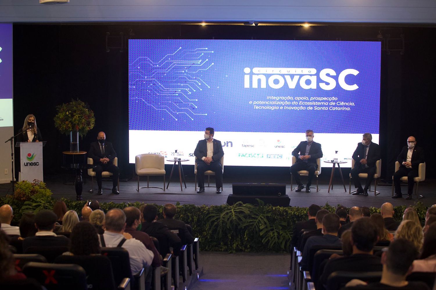 “O papel da Fapesc não é só de fomento, mas de interação, de articulação e de levar a ciência, a tecnologia e a inovação para todo o estado de Santa Catarina, gerando, ainda, conhecimento em todas as áreas e melhoria na qualidade de vida dos cidadãos”. Foi o que disse o presidente da Fundação de Amparo à Pesquisa de Santa Catarina (Fapesc), Fábio Zabot Holthausen, durante a palestra que teve como tema “Inovando Santa Catarina”, e que faz parte da programação do primeiro encontro do Circuito Inova SC, nesta quinta-feira (21/10). A Unesc foi a Universidade escolhida para o início dessa grande trajetória que vai percorrer outras 12 instituições do Estado. Evento promovido pela Associação Catarinense das Fundações Educacionais (Acafe) com apoio da Fapesc, ocorreu no Auditório Ruy Hulse, na Instituição.