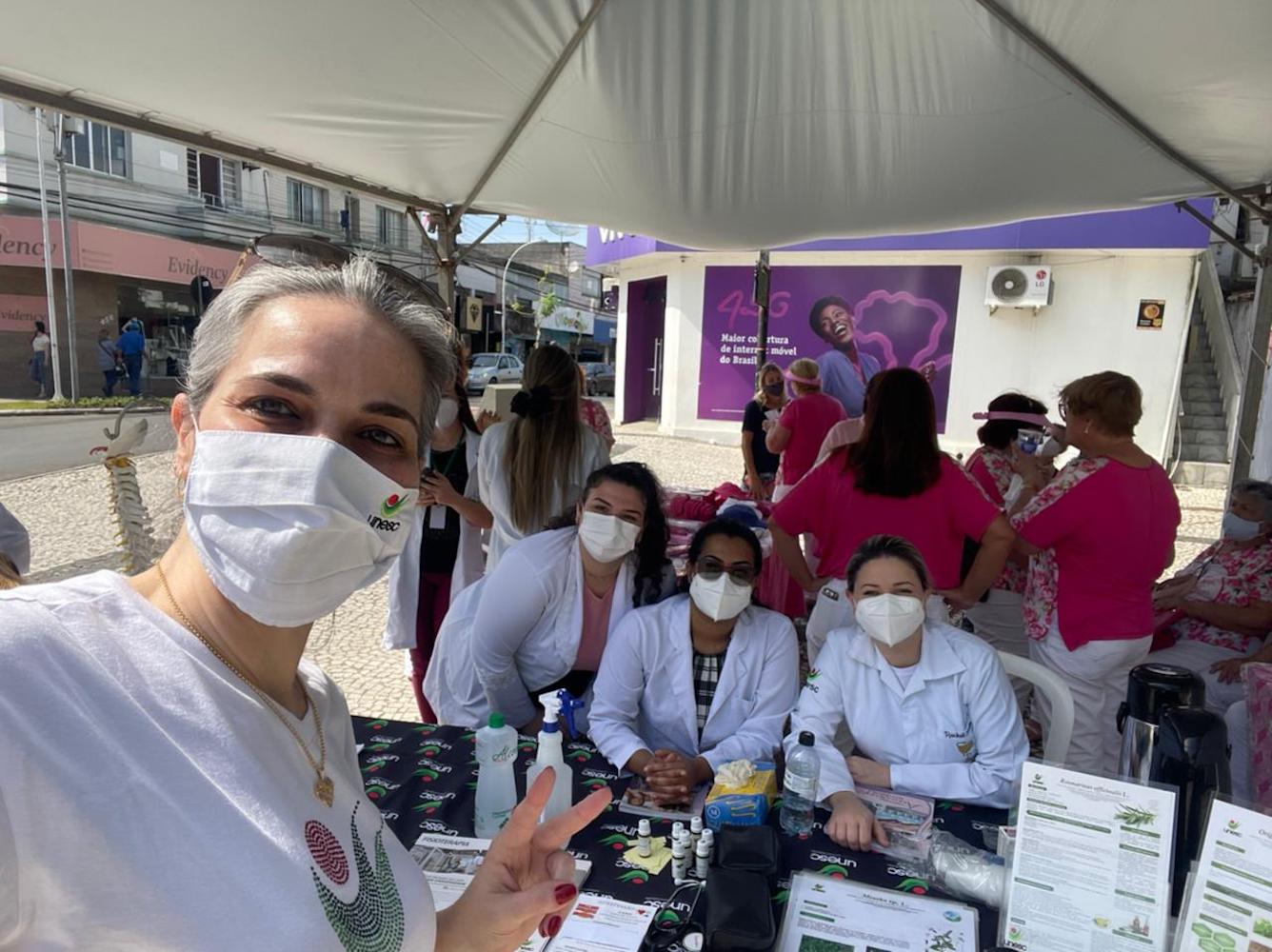 A manhã ensolarada deste sábado (23/10) foi marcada por importantes atividades de professores e acadêmicos da Unesc. Como parte da programação do Outubro Rosa, acadêmicos do curso de Farmácia e de Fisioterapia estiveram na Praça São Donato, em Içara, realizando diversas atividades na população que passou pelo local. O evento, em parceria com a Rede Feminina de Combate ao Câncer de Içara, tem o intuito de despertar a prevenção ao câncer de mama e a outros tipos de doença.