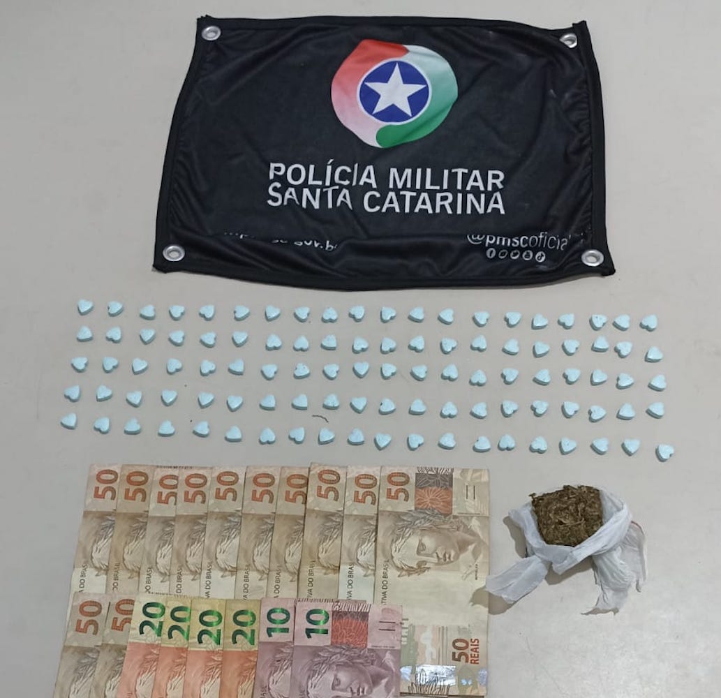 Já durante a revista pessoal e no veículo do suspeito, foram encontrados R$ 700,00, nove gramas de maconha e 100 comprimidos de ecstasy. Diante dos fatos, o homem recebeu voz de prisão e foi encaminhado à delegacia.