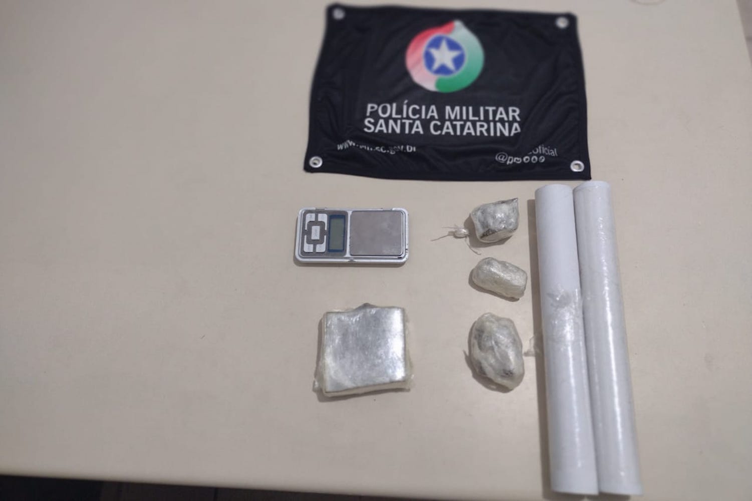 Nenhum material ilícito foi encontrado com o suspeito, que foi abordado em frente a sua residência. Já durante a revista no imóvel, os militares encontraram aproximadamente 225 gramas de maconha, um pequeno invólucro de cocaína e uma balança de precisão. Com isso, o homem recebeu voz de prisão e foi encaminhado à delegacia.