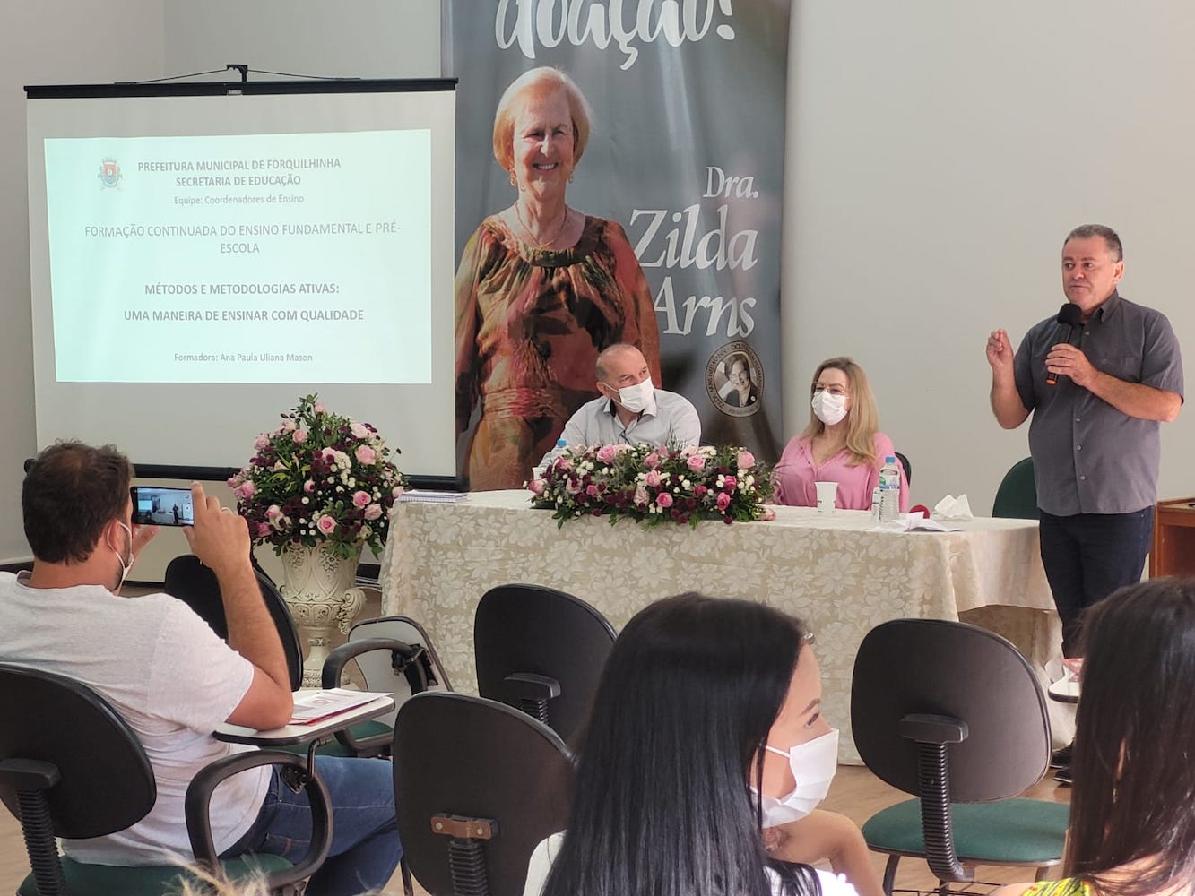 O prefeito em exercício, Célio Elias, a presidente em exercício da Câmara de Vereadores, Ivone Minatto, e o secretário de Educação Félix Hobold recepcionaram os participantes. “O professor tem o papel fundamental na formação de cada cidadão junto às famílias. Precisamos valorizar e agradecer a esses profissionais, que estão na ponta transmitindo conhecimento para uma sociedade melhor”, disse Célio Elias.