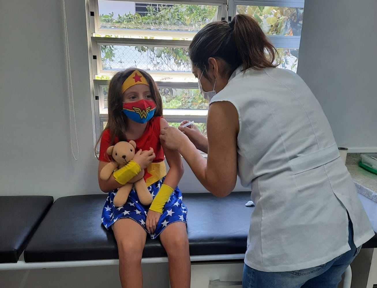 Enquanto recebia a vacina, acompanhada de sua mãe, Elisa segurou um urso de pelúcia para lhe dar ainda mais coragem. Ela estava ansiosa por receber a imunização e fez questão de comparecer ao local fantasiada.