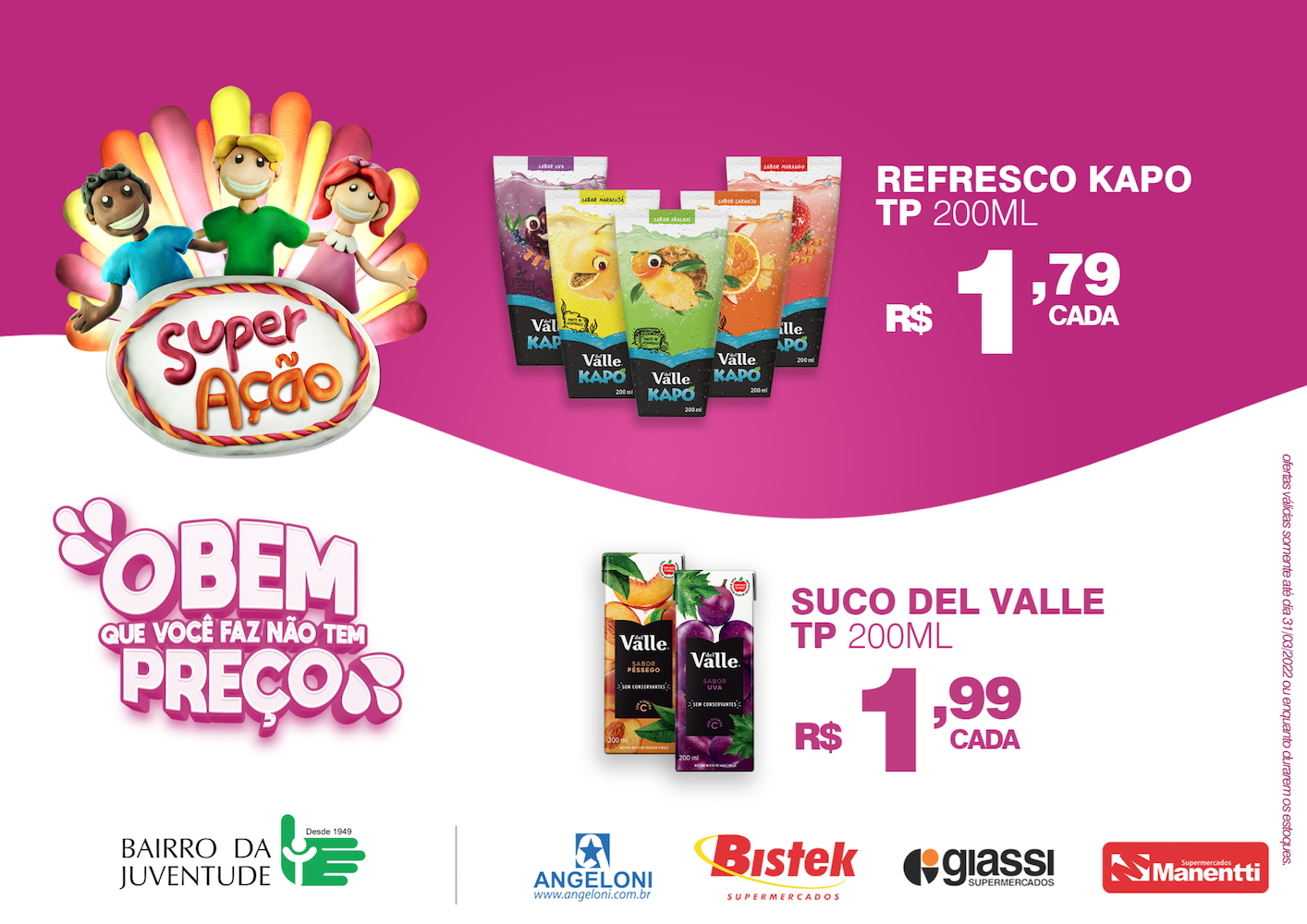 Os produtos que integram a campanha são o Refresco Kapo, 200ml, a R$1,79 e o Suco Del Valle, 200ml, a R$ 1,99. Parte do valor obtido com a venda dos produtos será encaminhada à instituição, que atende 1,6 mil crianças, adolescentes e jovens. Em 2021, a SuperAção arrecadou aproximadamente R$ 926.000,000, valor fundamental para a manutenção do Bairro.