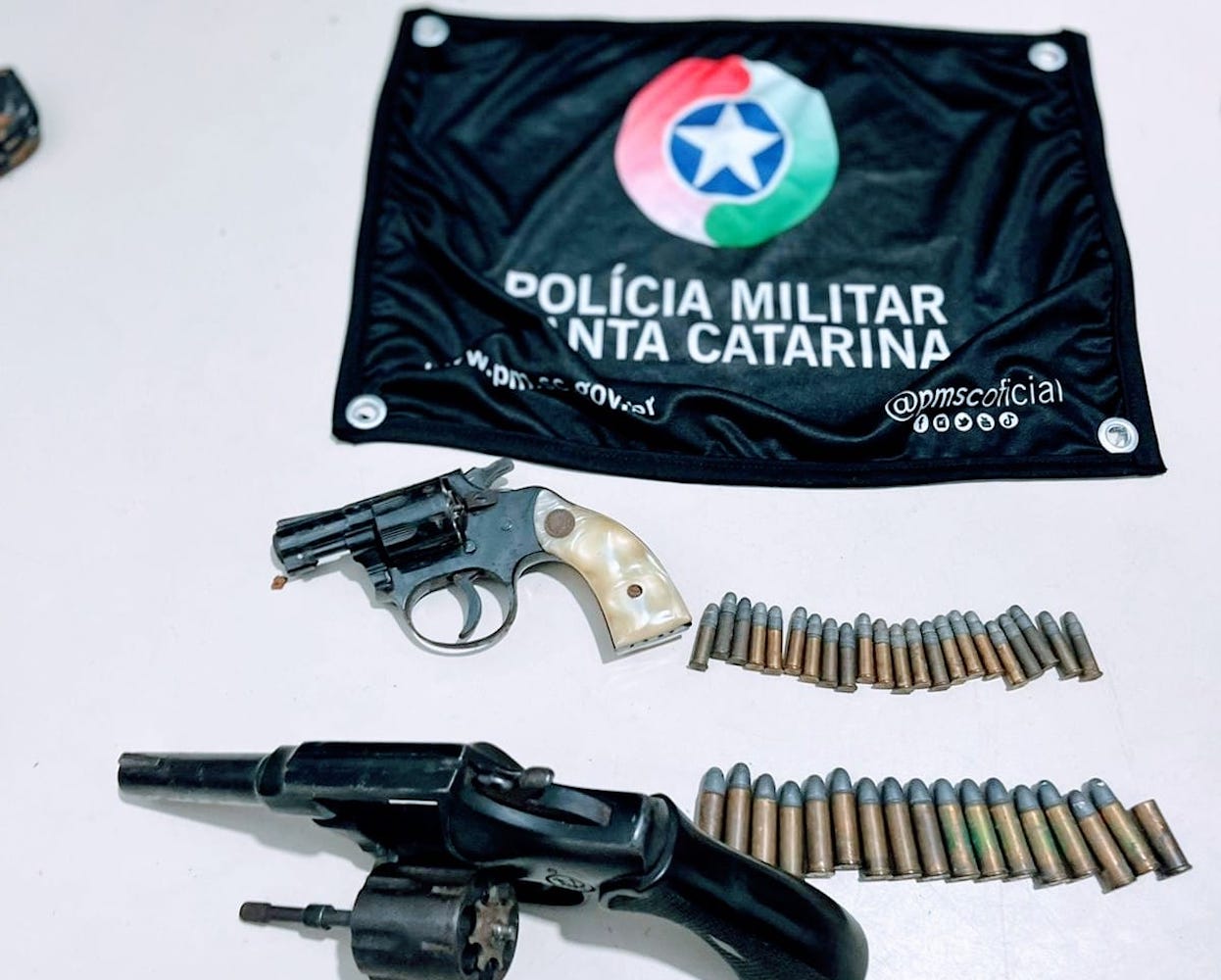 De acordo com as informações do 9º Batalhão da PM, a primeira ocorrência foi registrada por volta das 21h10 desse sábado, no bairro Pedro Zanivan. Os policiais foram até o local após uma denúncia de que havia ocorrido um disparos de arma de fogo. No local, as guarnições encontraram um dos homens, que relatou ter tido uma briga com um vizinho. Os militares receberam a indicação do local onde estaria o suspeito de ter efetuado o disparo e encontraram o homem, que confessou ter atirado para o chão, com objetivo de apaziguar a briga que estava ocorrendo. Ele indicou o local onde a arma estava e, assim, os policiais encontraram um revólver de calibre 32 com numeração raspada, um revólver de calibre 22, 22 munições da mesma arma, 16 de calibre 32 e uma munição de calibre 32 deflagrada.