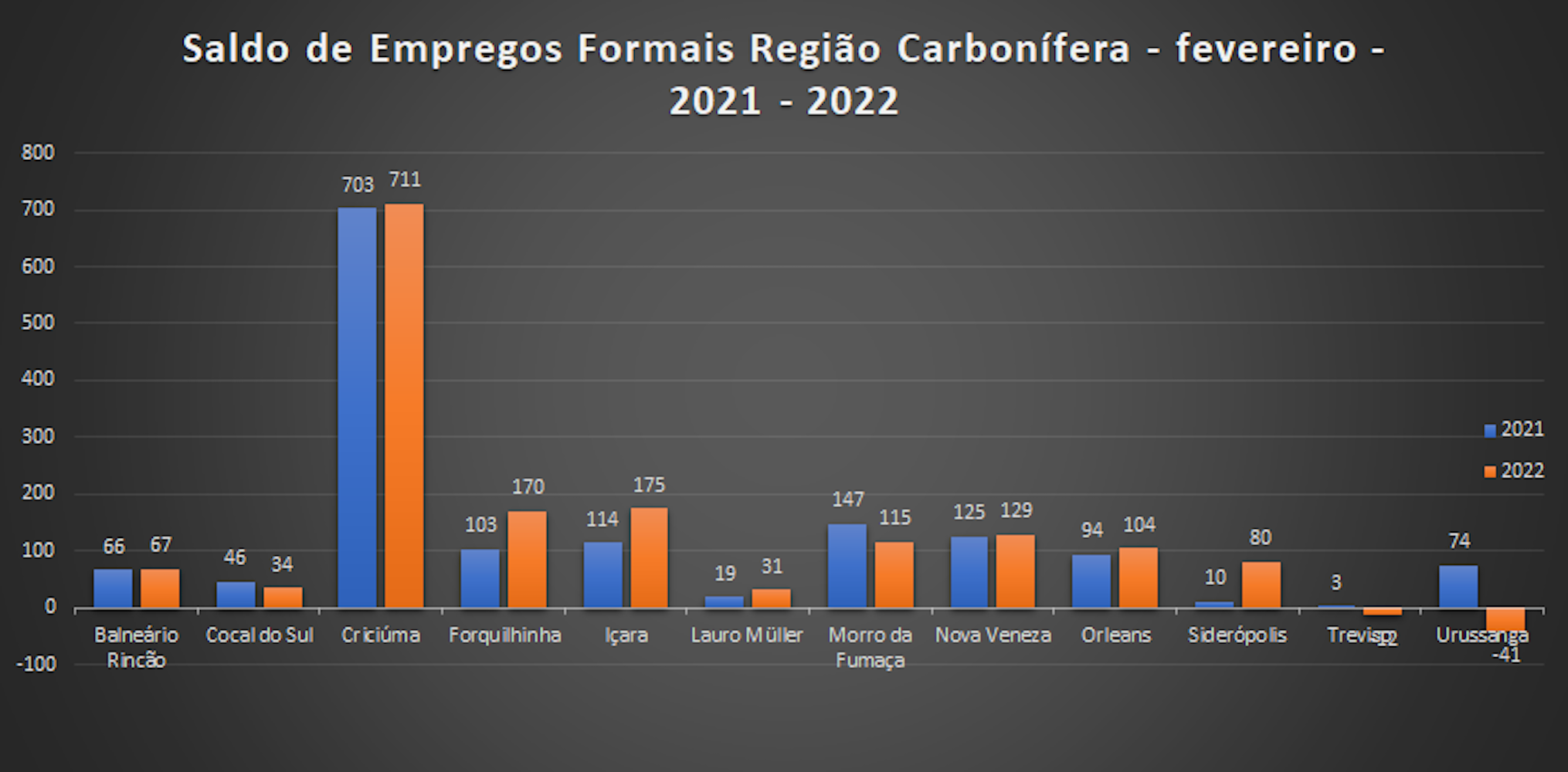 No mês, mais oito municípios apresentaram saldo positivo: Içara, 175; Nova Veneza, 129; Morro da Fumaça, 115; Orleans,104; Siderópolis, 80; Balneário Rincão, 67; Cocal do Sul, 34; e Lauro Müller, 31. No acumulado do ano, apenas Urussanga (-76) e Siderópolis (-1) mantêm saldo negativo.